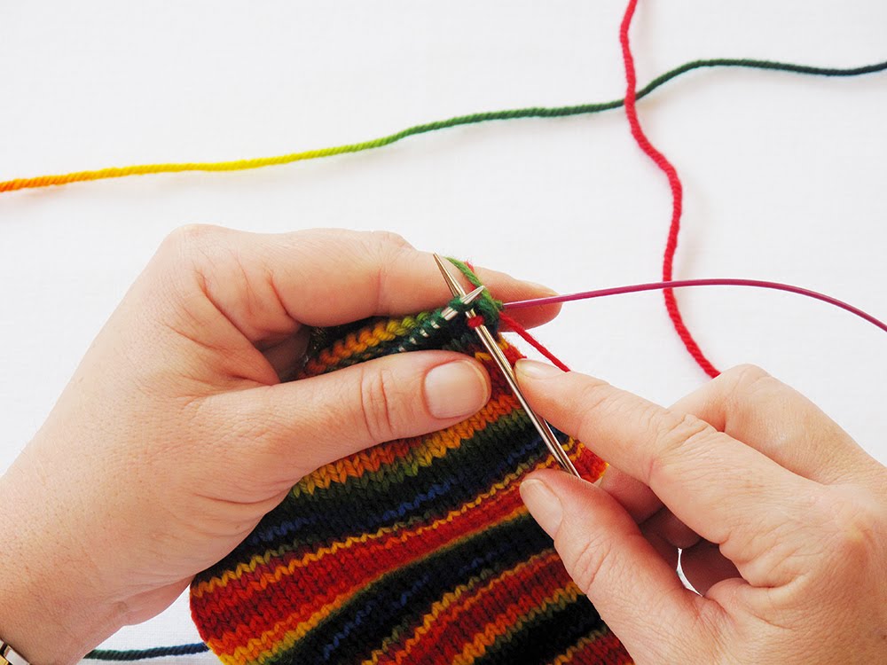 The variegated yarn forms part of a stripy pattern, and it would be better to avoid cutting this yarn and joining the new red yarn to it via a knot. Why? Firstly, you want to try and make the overall pattern continue in a similar way around the foot, with minimal disruption of the different coloured stripe effect. In addition, I hate knots in a sock, so I find it better to weave the ends of yarns in rather than making knots and then weaving in the ends. The knot can make a hard uncomfortable bit rubbing against your shoe. But then how do you avoid making a knot and still keeping everything tensioned correctly? In this way...